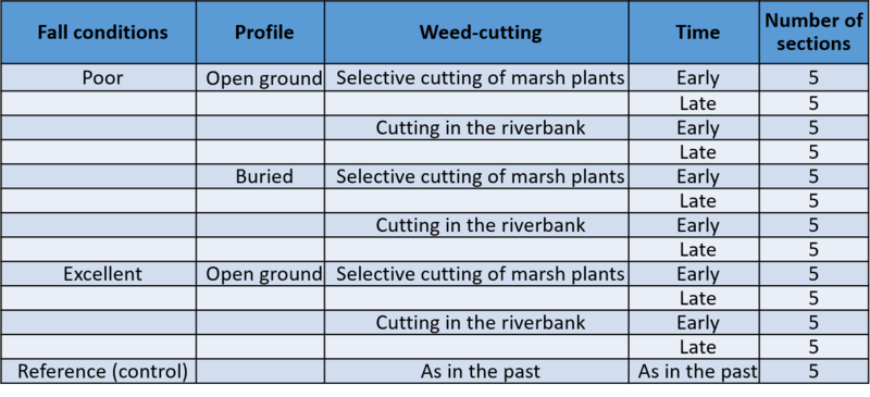 A total of 65 streams are included in the study. In five sections, the municipality's weed-cutting people continue to cut as usual, while at 30 sections cutting is exclusively done on the large aquatic plants in the stream (selective cutting of aquatic plants). At other 30 sections, cutting is done exclusively at the riverbank. In this way, we examine whether it is possible to achieve a better water flow capacity in the streams by cutting the plants that cause the greatest resistance to the water flow. At the same time, we will investigate whether there is an increase in underwater plant biomass in the streams due to improved light conditions and whether this will improve the physical conditions as well and, thus, the living conditions for small animals and fish.