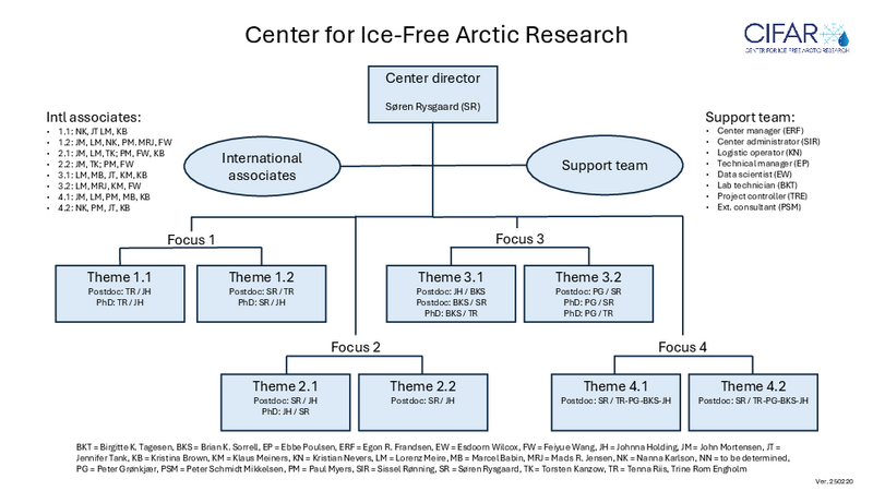 CIFAR is headed by a core group consisting of Center Director, Professor Søren Rysgaard, three additional senior core members from Aarhus University: Professor Tenna Riis, Professor Peter Grønkjær and Associate Professor Brian K. Sorrell and a junior core member: Assistant Professor Johnna Holding also from Aarhus University.