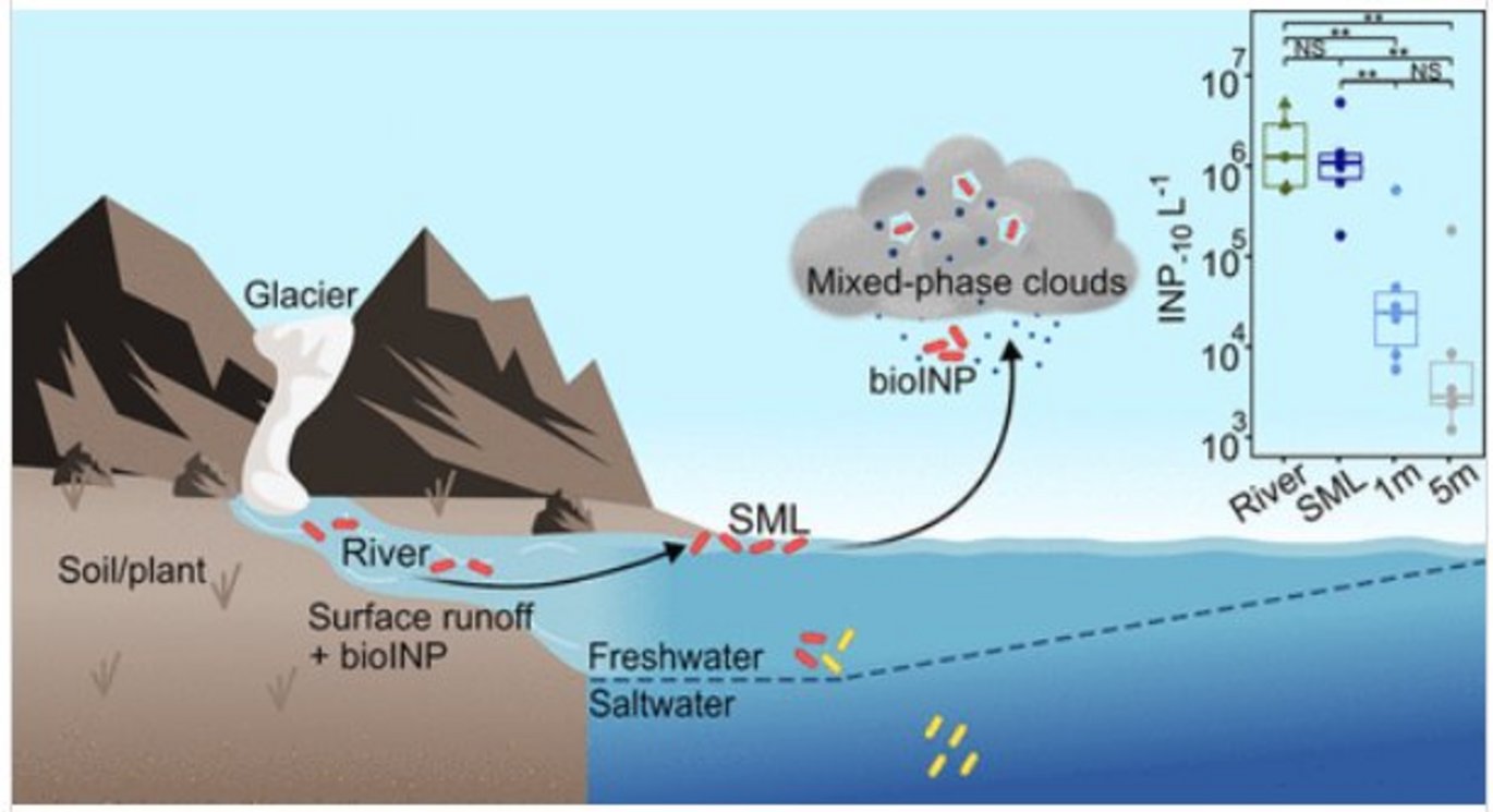 Biological aerosols serve as efficient ice-nucleating particles (INP), driving the liquid-to-ice transition in clouds and thereby shaping cloud thickness, lifetime, albedo, and precipitation. Although atmospheric INP derive from terrestrial, freshwater, and marine environments, their specific sources and microbial producers remain largely unresolved, especially in the rapidly warming Arctic. Here, we examine terrestrial runoff as a driver of INP enrichment during summer in Young Sound fjord, Northeast Greenland. INP concentrations active at −10 °C were significantly elevated in the sea-surface microlayer (SML) and at river outlets relative to underlying seawater, correlating negatively with salinity and distance from freshwater input, highlighting terrestrial runoff as a dominant source of warm-temperature INP. We identify a novel runoff-driven mechanism of SML formation in Arctic coastal waters, whereby terrestrial particles and compounds are transported downstream and selectively accumulate at the air–water interface likely due to their surface-active properties combined with limited seawater mixing driven by salinity gradients. Biological INP were also observed in the atmosphere (1.3–25.3 INP–10 m–3), with sequencing data suggesting terrestrial origins. Our findings demonstrate that terrestrial ecosystems strongly enrich the coastal SML with biological INP, constraining the pool of potential atmospheric INP sources and underscore Arctic coastal interfaces as key regions for cloud-relevant processes under ongoing climate change.