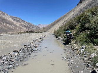 The Bartang Valley in Tajikistan was definitely the most remote place we have visited on the trip! The road breaks up often, disappearing into scree or a full river. We carried our bikes through very fast, very cold, waist-deep river crossings many times! Cars are rare and frequently can’t get through. For the first half of the valley, villages sit on small flats above the river, and in-between there are long stretches of loose rock and dust. In the second half of the valley the villages disappeared, and we saw no one but one jeep in three days.
